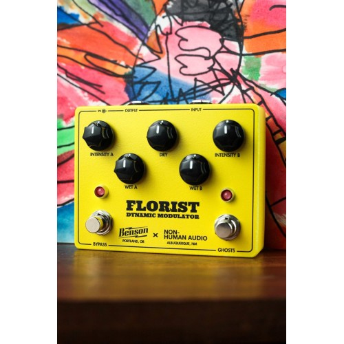While the Florist starts with the core idea of the Slow Loris, it is something else entirely and is not a revision or modification of the original. For instance, the delay range on the Florist is way faster than the original. We also redesigned the signal path for higher fidelity, and use a compressor type detector circuit for controlling the delay speed. We add a second delay channel using its own different detector to try to achieve some through-zero flanging and tri-chorus sounds. The two wet signals and the dry signal have independent volume control (DRY, WET A, and WET B) to blend the signals together. The two wet signals have independent intensity controls (INTENSITY A and INTENSITY B) corresponding to the respective volume controls.
